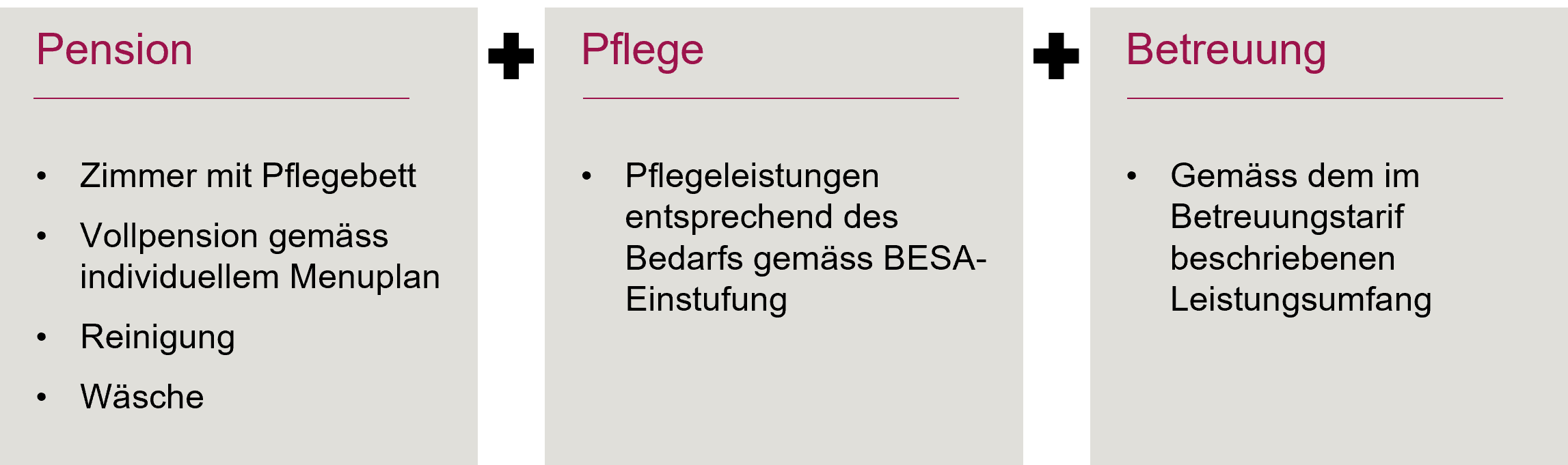Alle Tarife und Beiträge verstehen sich in CHF pro Tag und Person und gehen zu Lasten des Bewohnenden. Für die Pflegekosten wird dem Bewohnenden ein Eigenanteil erhoben. Die Pflegezuschläge der Krankenkasse und der Wohngemeinde werden von der Gesundheitsdirektion Kanton Zürich festgelegt (Normkosten je Pflegetag). Die Details entnehmen Sie der Preisliste.